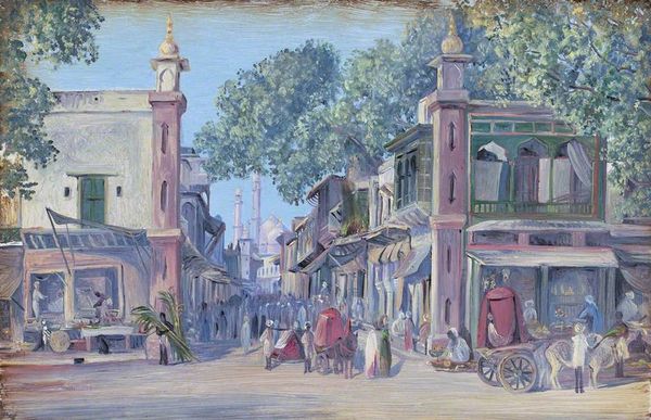 Editor: Here we have Wilhelm Kuhnert's "Straßenszene auf Ceylon," painted in 1907, using oil paints. The first thing that strikes me is the activity—it really captures the bustle of a street scene. What draws your attention in this painting? Curator: I'm fascinated by how Kuhnert uses recurring imagery to evoke Ceylon, now Sri Lanka. Consider the palette. The warm earth tones and vibrant flashes of color – the saffron robes, the exotic fruits – speak to a Western audience's constructed memory of the "Orient" during that era, referencing European exoticism and colonialism. Editor: So you're saying these details play into a kind of... visual shorthand for the region? Curator: Precisely. Observe the animals: the languid dogs, the water buffalo. Animals often represent freedom and abundance, but in a colonial context, can those meanings shift? And how do people read these images through contemporary eyes? What might this Ceylon street have symbolized to its inhabitants then versus now? Editor: That’s a really interesting point, because what feels almost idyllic to me now might have been experienced very differently back then. Are there other clues within the composition? Curator: Note how the figures in shadow are rendered, contrasted to the light falling on figures near the front. Kuhnert seems focused on certain faces more than others. Can we consider this Orientalism, if not cultural tourism? What’s missing from our field of view? Editor: I hadn’t considered the role of light in emphasizing certain subjects over others. That definitely adds another layer to how I see this piece. Curator: Right? By dissecting the visual vocabulary employed, we start to unearth the complex, sometimes conflicting, layers of meaning embedded in the work. Therein resides it’s powerful pull!