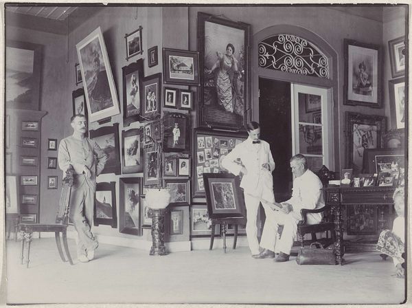 Curator: This photograph, titled "Schilder Hobbe Smith met een model in zijn atelier aan het Sarphatipark 42, Amsterdam," likely taken between 1903 and 1928, offers a glimpse into the working life of an artist. What strikes you initially about the image? Editor: It's quite busy, isn’t it? There are so many paintings crammed into the space, creating an immersive scene of artistic production. What story can we extract about the life or process that took place there? Curator: Note how the photograph meticulously documents the contents of the studio: canvases in varying states of completion, frames stacked against walls, and props deliberately arranged to suggest a space of curated creative labour. What does it say about the commodification of artistic skill and taste during the time it was created? Editor: It seems like the space itself is almost staged. Even the model, dressed in what appears to be slightly exoticized clothing, seems posed as a prop. Does the image critique or celebrate artistic labor, given its obvious construction? Curator: Exactly. Consider the role photography played in shaping perceptions of artists and their working environments. It almost creates an artistic myth. The photograph displays evidence of process while reinforcing a particular image of the artist. What kind of consumer appetite fuelled such representations of labor? Editor: So, instead of romanticizing the artist, it’s about unpacking how this space, through its materials and their arrangement, reveals the relationship between art, labor, and how it’s sold? Curator: Precisely. By examining the means of production displayed here, the space itself becomes an exhibit about the art world's marketplace and material reality. The photo demystifies nothing - rather it adds to the constructed legend! Editor: That's fascinating. I never would have thought of a photo as showing how the artist manufactures this narrative by controlling the scene, but by using this approach it shows how even what appears personal may actually be deeply tied to market expectations.