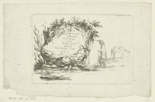 Editor: So, this is "Titelblad," created by Jens Petersen Lund in 1764. It seems to be an etching and engraving in ink. It's quite small, almost delicate, with an overwhelming sense of detail for something so tiny. What immediately strikes you about this print? Curator: I am drawn to the work's interplay of line and form. Notice how the artist has deployed varied line weights and densities to create the illusion of depth and texture within a relatively limited space. The composition invites the eye to travel across the landscape, pausing on details such as the inscription nestled within the rock formation. Consider how the inscription, itself a structured element, functions within the more organic forms of the landscape. Editor: It's interesting you highlight the inscription; I hadn't considered how integral it is to the piece. I was focused on the picturesque elements – the crumbling architecture, the suggestion of figures in the landscape. Do you think there's a specific relationship between text and image being created? Curator: Precisely! Observe how the artist frames the inscription using the natural elements, mimicking a classical tablet or cartouche. In effect, the text becomes a compositional element, possessing both symbolic and structural importance. Do you discern a narrative unfolding through the arrangement of forms and textures? Editor: Now that you mention it, there is a definite sense of narrative tension between the structured inscription and the wildness of the landscape. It is like two different realities coexisting in the same frame. Curator: A keen observation. This tension gives the work a subtle dynamic quality. The work reminds me to continue paying attention to how the individual components construct the whole. Editor: Agreed. Examining "Titelblad" with your insights has really opened my eyes to the depth that even small-scale prints can achieve. I am now much more attuned to the subtle yet powerful interactions of form and meaning in landscape art.