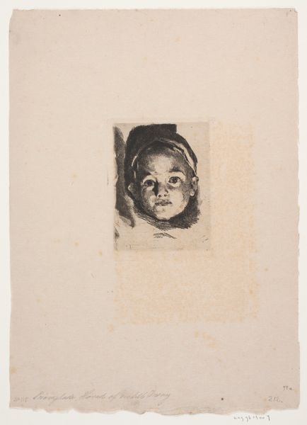 This is Emilius Wilhelmus Dehé's diminutive print of an unknown baby, now residing at the Rijksmuseum. Made with etching, its small dimensions belie the visual intensity achieved through tightly packed lines and contrasting textures. The composition is dominated by the baby's face, rendered with an almost hyper-realistic detail that pulls the viewer into an intimate encounter. Note how the artist uses the density and direction of etched lines to model the soft contours of the infant's face. This manipulation of line serves to emphasize the subject’s delicate features, while simultaneously creating a sense of depth and volume within the two-dimensional plane. The cross-hatched background, by contrast, acts as a stark formal counterpoint, pushing the figure forward. This tension between figure and ground activates the visual field, destabilizing any easy reading of the image. It challenges fixed notions of representation and highlights the constructed nature of perception itself. The artist invites us to reconsider the semiotic relationship between the depicted subject and the cultural codes we use to understand it.
