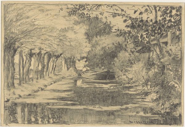 Curator: Pissarro’s etching, "In the Fields at Ennery," from 1875 presents us with a seemingly tranquil country scene. My first thought is how it feels remarkably contained and balanced, given the subject matter. Editor: Indeed, there is an equilibrium. Note how the artist employed hatching techniques, cross-hatching primarily, to create nuanced values in this monochrome landscape. This strategy directs our attention, allowing the artist to emphasize certain planes and draw out lines that are not visible at first glance. Curator: Beyond the skillful cross-hatching, Pissarro offers us a slice of rural life during a period of profound change in France, following the Franco-Prussian War. Editor: I notice that a figure ambles on the road into the light. This detail seems crucial. It’s about leading the eye toward some vanishing point in a space dominated by this web-like framework, but is the image hopeful or despondent? I’m left conflicted. Curator: Pissarro lived in Pontoise. The figure may simply be walking to town or a neighboring farm. Still, art historians have also linked Pissarro's focus on rural labor with burgeoning socialist sentiments. This image gives visibility to the common person whose work went largely unrecognized. The rural world has historically provided artists with themes to demonstrate the impact of social and economic transformation. Editor: A provocative hypothesis! For me, this print stands out because Pissarro is less concerned with photographic precision. Instead, there's a certain openness to the scene and a clear emphasis on mark-making that imbues it with character. Curator: This work helps us think about Pissarro's place within the Impressionist movement as well, even as it complicates the conventional narrative. We know he painted landscapes, yes, but examining this etching illuminates another side of his practice. Editor: Well, this etching provides a richer, if more subdued, articulation of Pissarro’s vision. Curator: Absolutely, a subtle statement rendered through confident handling of line and form.