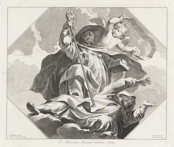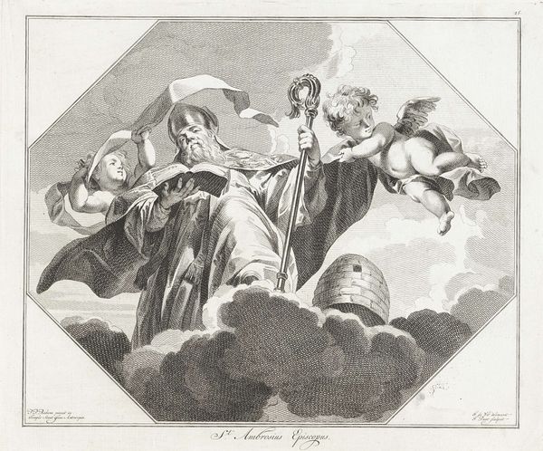 Curator: Here we have Jan Punt’s engraving, "H. Hieronymus," made sometime between 1721 and 1779, now residing at the Rijksmuseum. Editor: Woah, my first impression is dramatic, but heavenly too. The figure enthroned on what looks like clouds, an angel trumpeting… very Baroque, very theatrical. Curator: Precisely. Punt worked extensively as an engraver, often reproducing history paintings and allegorical scenes like this one. It is an exquisite display of line work and tonal range considering the limitations of engraving at the time. It shows his deep understanding of the conventions of Baroque art. Editor: Looking closely at the rendering of Saint Jerome—his muscularity, his aged face—the details are incredible! But I also see that it's more than a portrait. Look, a lion cowers beneath his foot. Symbolism alert. I mean, to have such mastery with essentially just lines! What kind of tools and process would he use? Curator: Engraving demands precision and patience. Using a tool called a burin, the artist would carve lines directly into a copper plate. The depth and density of these lines determine the amount of ink held and transferred to paper. Punt was likely trained within a workshop, learning techniques passed down through generations. And it's all about control really and having just the right level of pressure. You could mass-produce but always had the quality of handmade artistry at its core. Editor: Absolutely. And understanding the labor really enriches our perception, doesn’t it? It’s like imagining him meticulously etching away, building up this vision bit by bit, creating light and shadow. It really captures the Baroque taste for ornate complexity, especially within that slightly clunky, but neat square frame. It feels less religious and more celebratory. Curator: That celebratory mood reflects a society that used art to project power and prosperity. Prints made art accessible to a wider audience but equally played their part in circulating ideas that cemented the status quo of the Dutch Golden age. Editor: That’s so true! Something that feels almost otherworldly in its beauty is firmly rooted in society of the time. Well, looking at Jan Punt’s world through the lens of his work, makes you see it more clearly. Curator: Yes. Engaging with the work both enhances and challenges our view. An artwork indeed connects us to people who thought, believed, and created within it.