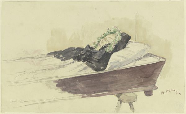 Curator: Carl Larsson's watercolor from 1895, "Daddy's Room," shows a corner of domestic tranquility—though "tranquil" might be a stretch considering whose room it is! Editor: It feels instantly homey, doesn't it? Though I must say, the prevalence of red—around the windows, outlining the built-in bookshelves—gives the scene a certain… intensity. Almost a playful aggression against all that muted white. Curator: Larsson certainly wasn't afraid of color. Here we see his mastery of capturing light and space. Consider how he orchestrates your eye from the foreground boots to the reflected light in the mirror at the back. Every object placed just so! Editor: The boots… abandoned in a rush? And what about the half-open door leading into another room? The composition here tells the narrative. Are we meant to understand this is the dad on his way out, or finally coming home to roost? I bet they are Carl's Curator: Maybe. It's a window into their intimate lives. Remember this work comes from a series called *A Home* , it was not originally received all that well as some contemporaries thought it was narcissistic of Carl to represent only he, his wife and children, in his oeuvre Editor: Narcissistic, perhaps, but powerfully evocative nonetheless. The unmade bed and the simple arrangement of the furniture have a sincerity that is captivating to look at. Is the glass half-empty or half-full? Daddy just left or daddy has arrived Curator: True. Though Larsson’s artistic choices create layers that invite interpretation and feeling beyond what appears. The overall effect is, simply, comfort. Even the shadows dance with purpose, a kind of visual poetry I suppose Editor: The intimacy conveyed here really highlights what a master artist is capable of, using the visual language, of semiotics of things and space around his family. The symbolism elevates this beyond merely a rendering into a truly great painting. Curator: It is an embrace, not only from Larsson to his space and family, but an invite for us to his private universe.