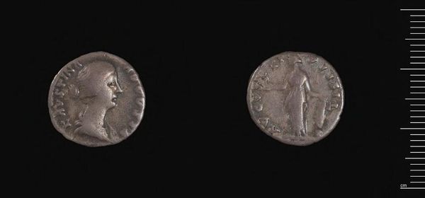 Curator: The object before us is a denarius, a silver coin, bearing the image of Faustina II. Editor: The metalwork is quite striking, even in its aged condition. I’m drawn to the stark contrast between the raised portrait and the flat background. Curator: As the wife of Emperor Marcus Aurelius, Faustina's image on coinage served as potent propaganda, linking her to imperial power and projecting an image of stability. Editor: I can see how the profile is deliberately styled to convey power, the rigid lines and unwavering gaze are very commanding. Curator: Indeed, these coins circulated widely, embedding her image and therefore the empire's authority within daily life. It is more than just money; it is a tool for shaping social perceptions. Editor: Examining the formal qualities shows a controlled and measured approach to artistic creation. It is not just what is represented, but how it’s been presented. Curator: These objects help us understand how power operates through imagery. Editor: Precisely, and how simple forms can convey complex messages.