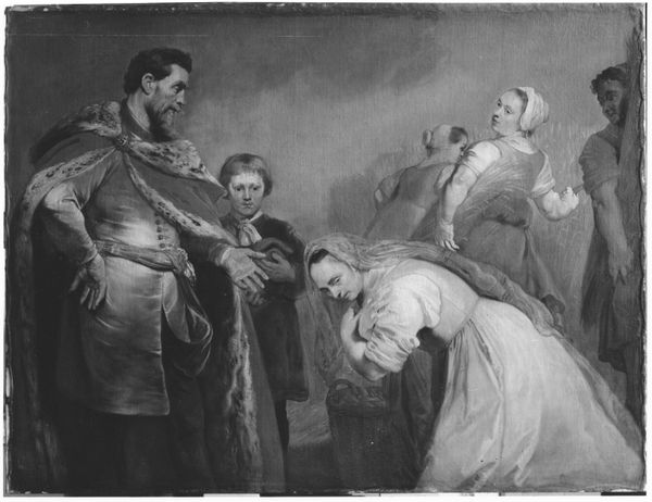 Editor: Here we have "Republikken eller Det gemene Bedste, III akt, 10. scene," created in 1814 by C.A. Lorentzen, painted on canvas. It looks like a tense scene, but also stagey, you know? All the figures are posed just so. What strikes you about this piece? Curator: The immediate thing I notice, before even considering the neoclassical style, is the materiality of the document the central figure holds. Consider the production involved: the paper-making, the ink, the transcription... the sheer *labor* condensed into that stack of pages. Editor: So, you’re focusing on the materials themselves and the work that went into them, not just the story being depicted? Curator: Exactly. How does the painting itself act as a form of commodity here, representing and simultaneously embodying production and consumption? This wasn't just divinely inspired genius; it was manufactured! Look closer: note the suggestion of almost industrialised methods for duplication inherent in this painting about performance. Where does "high art" end and manufacture begin here, and can they actually be divided at all? Editor: That’s fascinating. It almost makes me reconsider the artist’s role as not just an artist but something more of a factory. Is it then more about a factory or the commodification that went into the making? Curator: Indeed, but can one exist without the other? This painting invites us to consider art not just as a beautiful object or representation, but as a product interwoven with complex material processes and labor relations. That challenges our usual understanding, don't you think? Editor: I never thought about paintings this way, honestly. Now I see how looking at the actual creation challenges that ‘genius’ idea of art. Curator: And questions the idea of what a painting represents versus what the labor puts into its production? An interesting idea...