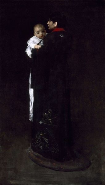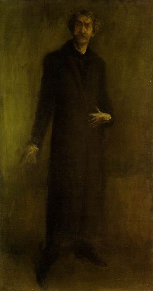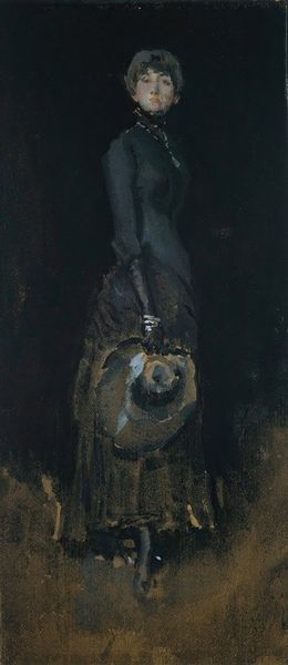 Editor: So, this is William Merritt Chase's "Copy of Velázquez’s Menippus," painted in 1882, using oil on canvas. It’s quite a dark painting, but the figure seems really present. How do you interpret this work? Curator: Considering Chase’s "Copy of Velázquez’s Menippus" through a materialist lens, it's important to consider why Chase chose to reproduce this particular work and how its meaning is altered through that reproduction. What statement is he making by re-producing it? Editor: Interesting. Well, given it is called a ‘copy’, wouldn’t its value be less, since it relies on the "original" labor of someone else? Curator: Not necessarily! Rather, we could look at how the means of artistic production have evolved from Velázquez’s time to Chase's. The social status of art-making, access to materials, and the rise of the art market all influence its meaning and consumption. Do you notice differences in brushwork, color palette, or composition? Editor: I do, actually! It seems more expressive, less restrained in a way. Were art academies pushing this expressive style at the time? Curator: Precisely! Now, considering those historical factors in his creation, how does Chase's copy differ materially and conceptually from Velázquez’s original, and what does that difference tell us about the changing landscape of art production? Editor: I suppose Chase elevates Velázquez’s "craft" to "art" by loosening up, showcasing the ‘artist’s hand,’ maybe to impress the academies and gain value in a changing art market? That's fascinating, I hadn't thought about it that way before! Curator: Exactly. By thinking about art as a product of labor, access, and consumption, we move beyond admiring skill and think about the bigger cultural picture, its context.