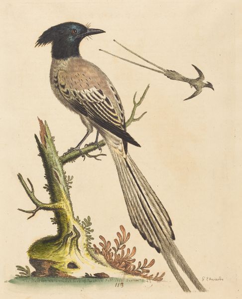 Mark Catesby created this print of "The Yellow and Black Pye" using etching and watercolor. Notice how the composition is structured around the verticality of the plant, contrasting with the horizontal stance of the bird. The interplay of colors—the bird’s vibrant yellow against the muted greens and grays of the flora—creates a visual tension. Catesby’s detailed rendering invites us to consider the semiotic codes at play. The bird, perched atop the plant’s bulb, engages with a small insect, suggesting themes of sustenance and natural interaction. The plant, rendered with scientific precision, points to the era’s burgeoning interest in natural history and classification. Consider how Catesby uses line and color to destabilize traditional artistic hierarchies. The scientific illustration elevates the natural world to a subject worthy of aesthetic consideration. This challenges the fixed meanings of art, inviting viewers to reconsider their relationship with nature.