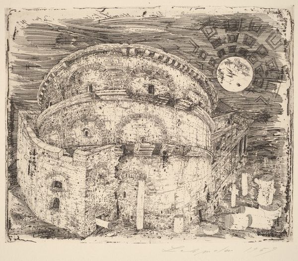 Anton Lehmden made this etching of The Castel Sant'Angelo, and it's like he’s building the image right in front of you. It's all about the line, a kind of scratching and building, layering up a vision. Looking closely, you can almost feel the burr of the etching needle biting into the plate. There's a raw energy here, a texture that pulls you in. The density of the lines around the Castel creates a palpable weight, an almost oppressive atmosphere. Then, the stark white spaces push back, keeping it dynamic. See how the lines don't just describe form, but also seem to suggest movement and disruption? It reminds me of Piranesi, but with a more personal, anxious edge. Lehmden is making something new out of the ruins of history, turning solid structures into mirages. Art’s like that, isn't it? Never just one thing.