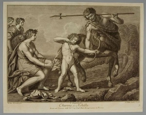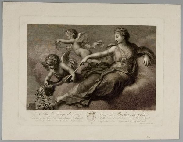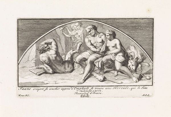 Curator: This is Simon Charles Miger’s "Hercules and Omphale," and I'm immediately drawn to its textures. Editor: Yes, you're right! The hatching and cross-hatching create a really soft, almost dreamlike quality. The whole scene feels so languid. Curator: It's a fascinating take on power dynamics, too. Omphale has Hercules' club while he's stuck spinning wool. It really speaks to the commodification of heroes. Editor: Interesting point! And Miger's choice of engraving emphasizes the physical labor involved in reproducing images. It's a direct connection between the artist's work and the mythological tale. Curator: I love how it flips the script, making us question these very traditional roles. The cherubs almost seem to be mocking the whole thing! Editor: It makes me think about the social function of art and its reflection in labor, a material record of a cultural moment. Curator: Definitely gives you a lot to ponder about, doesn't it? Editor: Absolutely. A rich combination of mythology and process, indeed.