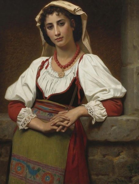 Jean-François Portaels painted this portrait of A Sicilian Woman, capturing her in traditional dress. Dominating the composition is the intricate white headscarf, a symbol rooted in Sicilian culture, often representing modesty and regional identity. The woman’s rosary beads intertwine with her fingers, a motif echoing across centuries of religious art. The act of holding beads is a gesture found not only in Christian iconography but also in Buddhist art, where prayer beads are used in meditation. This reflects humanity's collective search for solace and meaning. The woman's serene expression speaks to the emotional weight of faith, an image deeply embedded in our collective subconscious. This symbol transcends mere representation, resonating through time and cultures, adapting yet retaining its core significance. It resurfaces, reminding us of the powerful, cyclical nature of symbols in art and life.