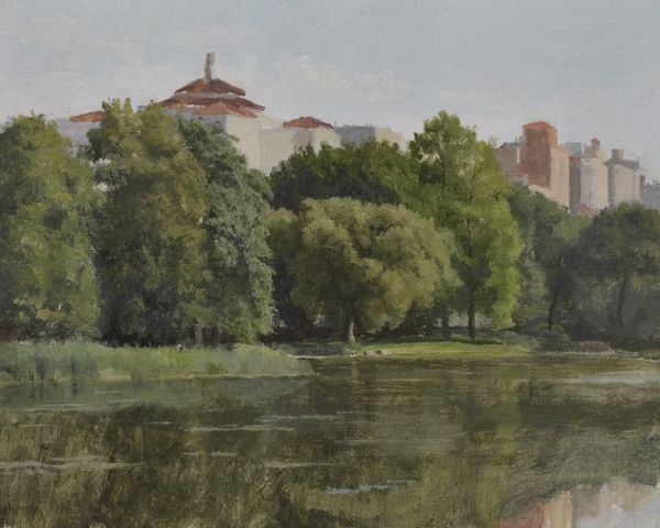 Editor: Here we have "The Pond Central Park," an oil painting by Joshua LaRock, done *en plein air*. It has a wonderfully subdued, almost melancholic mood, and I'm curious about its quiet statement. What's your take on this piece? Curator: I see in this painting a conversation about access and the constructed nature of 'nature' itself. Central Park, while seemingly a natural oasis, was a designed space, replacing what was once Seneca Village, a predominantly African American community. LaRock’s rendering, particularly using *plein air*, almost romanticizes this space. Editor: That's interesting! So, you're saying the painting, perhaps unintentionally, participates in a larger historical narrative about dispossession? Curator: Precisely. The focus on serene naturalism obscures the socio-political realities embedded within the park’s very existence. It compels us to ask: Whose nature is being represented here, and at what cost? Who has the leisure time and means to wander this park to take in these scenes of beauty? And perhaps, more pointedly, who doesn’t? Editor: I hadn't considered that at all! So, appreciating the painting also means acknowledging these complex histories it evokes. Curator: Absolutely. Can visual art encourage empathy and reflection around issues of displacement, access, and environmental justice when approaching it with open eyes? Editor: This has really broadened my understanding of landscape art and its potential social implications. Thank you. Curator: My pleasure! Hopefully, this conversation sparks ongoing dialogue about the power dynamics inherent in seemingly neutral spaces and how artistic representations might reinforce or challenge these realities.