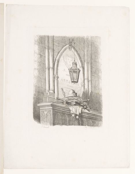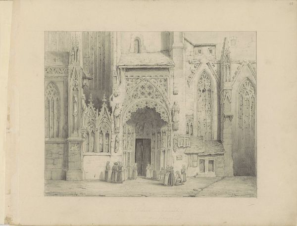 Editor: This is Herman Armour Webster's "Gateway of Grotesques, Sainte Ouen, Rouen." It’s a print, and the level of detail is striking, but there's also a certain darkness to it. What does this print communicate to you? Curator: It speaks to the romanticized view of gothic architecture popular at the time. Notice how Webster emphasizes the grotesque elements, aligning with a broader cultural fascination with the medieval and its perceived darkness. How does the print engage with ideas of religious institutions? Editor: I see what you mean about romanticizing the gothic era. Perhaps it's a comment on the church's imposing presence? Curator: Precisely. It prompts us to consider the socio-political role of the church and the public's evolving perception of its power.
