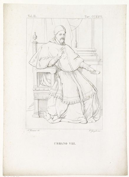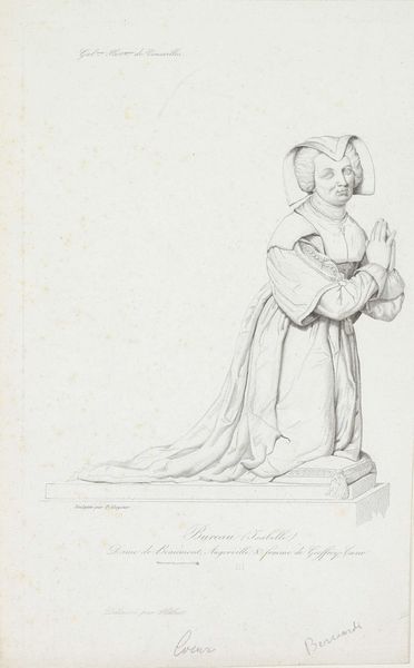Jacopo Bernardi's graphite drawing depicts a sculpture of Louis XI, King of France. The image captures Louis in a state of prayer, kneeling with hands clasped, dressed in royal attire adorned with fleur-de-lis, symbolizing French monarchy. Made in the 19th century, this drawing reflects a period deeply engaged with its own history, particularly the legacies of its monarchical past. France, in the wake of revolution and empire, was grappling with questions of national identity and historical continuity. The fleur-de-lis, prominently displayed, evokes a specific era of French royalty, and the act of depicting Louis XI in prayer suggests an interest in the moral dimensions of leadership. This work invites us to consider the role of art in constructing collective memory. We might ask, what aspects of French history were being emphasized, and why? Research into the political climate of 19th-century France, as well as Bernardi's own affiliations, could shed light on these questions.