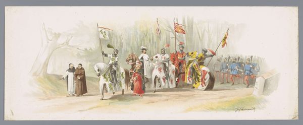 This is an anonymous print titled *Utrechtse maskerade van 1876*, commemorating a historical masquerade in Utrecht. In the late 19th century, the Netherlands experienced a surge of national romanticism, a movement which idealized the nation's past. Historical events like this masquerade became opportunities to celebrate collective identity and pride, reflecting a yearning for cultural unity. What strikes me here is the performative aspect of identity. These figures aren't just dressed in historical costumes; they are embodying a narrative of Dutch history. This masquerade blurs the lines between the past and present, and invites us to reflect on how we construct and celebrate our cultural heritage. Who gets to participate in these constructions of the past, and whose histories are being elevated here? Consider the emotional resonance of this event. As you look at it, how does this image make you feel about your own connections to national or cultural identities? This print serves not only as a visual record, but also as a mirror reflecting society's complex relationship with its past.