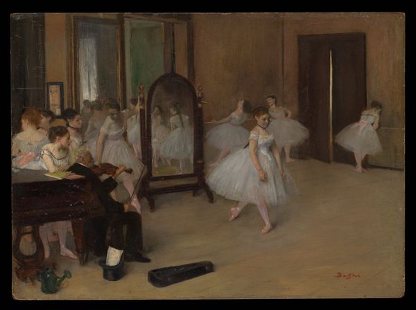 Curator: This is Degas' "The Ballet," circa 1880, rendered in watercolor and pastel. It’s quite striking how he captures a sense of immediacy. What stands out to you? Editor: I’m really drawn to the composition, the dancers are waiting in the wings, it looks like, ready to go onstage. I'm curious about Degas's perspective on this. What was he trying to say? Curator: Think about the materials. Pastel and watercolor. How does that choice impact the way we see the subject? It's not just about the dance itself, it’s about the making, the materiality. The pastel creates a textured surface, doesn't it? How does that texture play against the subject of the ballet, usually seen as ethereal and light? Editor: Yes, I see that! It gives a rougher, more real feeling to what would normally be thought of as graceful and weightless. Almost… gritty. Curator: Exactly. It's Degas drawing our attention to the *process* behind the performance, not just the perfected product. He’s showing the labour, the behind-the-scenes reality that goes into creating this illusion. How might the dancers’ social standing be linked to the patronage of the opera? What economic structures allowed these works to be made, these bodies to be trained, and these materials to be bought? Editor: So, he is interested in demystifying the Ballet itself, highlighting the work instead of the dream? Curator: Precisely. And it compels us to examine the social conditions that made such performances—and such artworks—possible. Now, how does focusing on materiality impact the narrative of art history, which is often so focused on aesthetic achievement? Editor: That's really insightful. It shifts the focus from beauty alone to the physical reality and social context, a completely different understanding. Thanks! Curator: It highlights that even seemingly ephemeral arts like ballet are rooted in tangible labor, materials, and societal structures. A new point of view, isn't it?