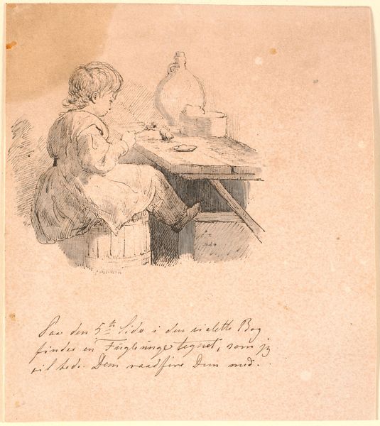 Curator: Here we have "Spurveungen," a lithograph by Adolph Kittendorff, dating to 1845, presently held at the Statens Museum for Kunst. Editor: My first impression is quiet intimacy. It is stark, though tender, rendered in strong lines, showing a young boy intently focused on something on the table before him. Curator: Indeed. Kittendorff, through this unassuming genre scene, gives us a glimpse into 19th-century childhood and societal values. Consider the deliberate use of realism; this wasn’t intended to idealize, but rather to document and engage with everyday life. Editor: The focus on the mundane certainly challenges idealized depictions of childhood. Is the sparrow then a symbol here, something vulnerable within the boy's grasp? Curator: Perhaps, or a tool, or a curiosity to deconstruct; the image lends itself to multiple readings depending on the context we bring to it. What does it tell us about the growing influence of empirical thought and dissection? Does that also relate to how this kind of intimate portrayal gained popularity with a broadening, less elitist art audience? Editor: Absolutely. With burgeoning urbanization came both scientific fascination and the sentimentality that accompanied recognition of what might be disappearing, especially rural life, and the relative freedom of children there. Curator: A critical juncture in social history reflected in the simple lithograph of a child examining a small bird. One can trace such subtle works' importance as indicators of wider cultural anxieties and values concerning nature, knowledge, and childhood innocence during industrial change. Editor: It seems almost too modern for its time, both honest and evocative. I see that honesty connecting with modern-day audiences. Curator: Precisely. Through careful analysis, it invites consideration beyond its time, enabling insights that linger long after a quick glance. Editor: Yes, it does offer rich layers for analysis from this delicate portrayal of an ordinary encounter.