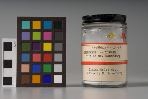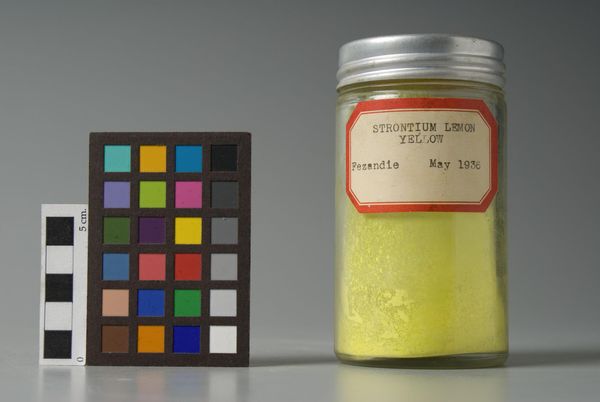 Curator: Here we have "Chrome Yellow Medium," a pigment manufactured by Fezandie & Sperrle. Editor: The color strikes me immediately; it's so vibrant, almost alarmingly cheerful. Curator: Yes, the intensity derives from its chemical composition. Chrome Yellow gained popularity in the 19th century, but its toxicity was a concern. The label dates it to May 1936. Editor: It's fascinating how such a seemingly innocuous jar of pigment carries the weight of industrial history. The exploitation of workers involved in mining the materials, the health risks... Curator: The grid of color swatches adds another layer of analysis, isolating hue and value. Editor: It forces a dialogue between the manufactured color and our own culturally constructed perceptions of yellow and its inherent symbolism, doesn't it? Curator: Precisely. A study in pure color, framed by history and social context. Editor: Indeed. A complex narrative condensed into one little jar.