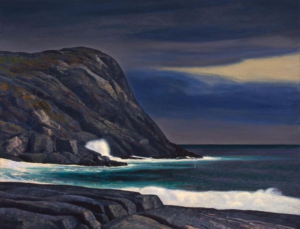 Editor: Terri Kelly Moyers’ “Primordial Hawaii,” painted in 2016, captures a very serene coastal scene using oil on what looks like canvas. I am drawn to the contrast between the rough rocks in the foreground and the softness of the sky. What visual relationships stand out to you? Curator: Immediately, I see how the artist plays with texture and light. Note how the impasto technique in the clouds gives them a tangible presence, contrasting with the smoother rendering of the water. The reflections act as a visual echo, fracturing the landscape and light. Editor: Can you say more about 'impasto'? Curator: Observe how the artist has applied thick layers of paint; this is impasto. It's most obvious in the clouds, but it subtly enhances the texture of the rocks as well. Consider how this technique creates physical depth on a two-dimensional surface. And, going back to those reflections, what do they signify compositionally? Editor: Maybe it's about symmetry, echoing forms between land and sky, creating a sense of balance within what could otherwise be a chaotic landscape? Curator: Precisely. The reflection is not merely mimetic; it reinforces the overall structure of the painting. Furthermore, look closely at the colour palette; it’s relatively subdued, primarily blues, greys and browns. How does the limitation affect your reading? Editor: Limiting the colour palette directs the eye toward the nuances in texture and tone, emphasizing the overall calmness. Curator: It's as if the artist aims to capture not just a visual representation, but also a feeling – a specific, contemplative atmosphere. Examining the formal choices of the artist truly enrich how one experiences a piece. Editor: I agree. Shifting focus to composition helps me to more clearly articulate what I appreciate in this artwork.