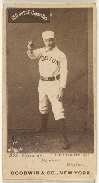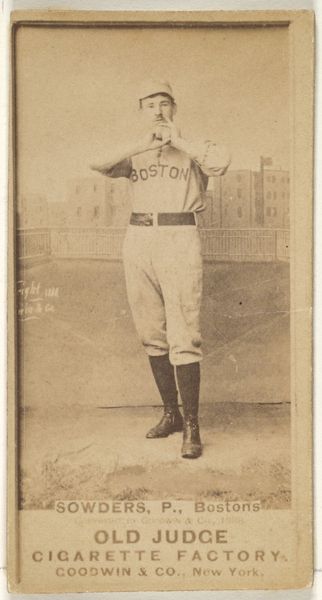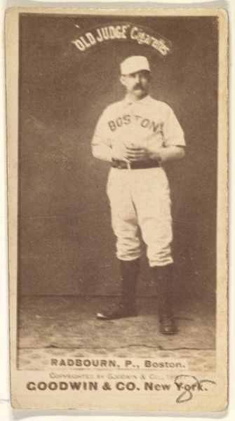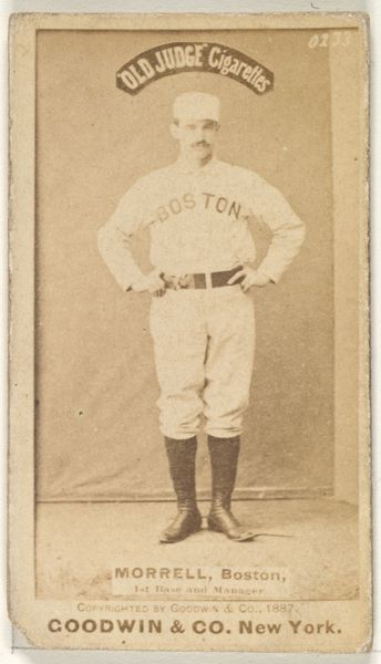 Editor: This sepia-toned print, dating from 1887, features "Honest John" Morrill, the first baseman and manager for Boston. It's from the "Old Judge" series of baseball cards by Goodwin & Company. What a compelling yet straightforward image! What do you see in this piece? Curator: I see a fascinating intersection of commerce, celebrity, and cultural identity taking root. Consider the cigarette brand, "Old Judge," using Morrill’s image. It isn't just about selling cigarettes. It's about selling an idealized version of American masculinity, success, and leisure, carefully packaged for consumers. Ask yourself, what does Morrill *represent* in this nascent baseball era? Editor: He's like a symbol of Boston pride, right? And the cigarette card format makes him accessible to everyone. Curator: Precisely. The card is a conduit. Notice the almost saint-like quality the sepia tone gives him. “Honest John.” This implies virtue and upstanding character, virtues increasingly valued during that period of rapid industrialization and urbanization. How do these cultural values enhance his marketability on the card? Editor: It creates trust, I guess. Like, "Buy these cigarettes, they're endorsed by an honest man." But is the idea of ‘honesty’ complicated by the fact that this image is selling an addictive product? Curator: An insightful observation. It highlights the paradox of image construction and manipulation. Symbols, like “honesty,” can be strategically deployed, regardless of underlying realities. The power of the symbol relies on its ability to tap into collective desires and cultural values. The photo memorializes both the person and an emotion for those that remember this man. What does that combination say? Editor: This image does more than sell cigarettes; it sells aspiration, belonging, even nostalgia for a simpler time that probably didn’t even exist. Curator: Well put. Symbols and their associated imagery speak volumes about the cultural moment of their creation and their enduring impact. I never expected so much to be packed into a humble baseball card.