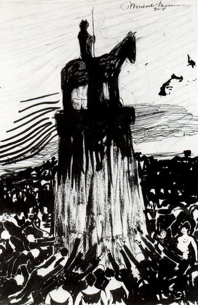 Editor: This is Julio Gonzalez’s "Figure in Glory," a drawing. The composition feels very stark and monumental. What do you see in this piece? Curator: I see a fragmented figure emerging, haloed by radiating lines, suggesting both transcendence and vulnerability. Notice how the linear forms evoke both strength and fragility— a powerful duality. Editor: The radiating lines are interesting, but how do you interpret the more abstract, almost architectural shapes within the figure itself? Curator: They remind me of fortifications, perhaps a defense against the tumultuous times Gonzalez lived through, the Spanish Civil War looming large. The figure stands as a symbol of resilience amidst chaos. Editor: That's a compelling interpretation, considering the historical context. It gives a new layer of meaning to the piece. Curator: Indeed, understanding the symbols helps us connect with the cultural memory embedded within the artwork.
