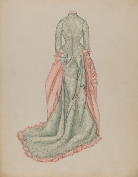 Fanchon Larzelere made this watercolor painting of a dress in the late 19th century. It is an exquisite, light blue gown with intricate floral patterns. The dress, with its elaborate bustle and beaded trim, reflects the fashion of the Gilded Age in the United States, a period characterized by rapid economic growth and vast disparities in wealth. Larzelere, born in 1855, lived through this era, and her artwork offers a glimpse into the material culture and social customs of the time. Clothing in this period became a potent symbol of status, mirroring the aspirations and social stratification of the era. The detailed rendering of the dress suggests Larzelere’s keen attention to the visual codes of her society. For historians, understanding the social context of this artwork involves examining sources such as fashion magazines, photographs, and personal letters. These documents can reveal the meanings attached to clothing and the ways in which they were used to negotiate social identities.