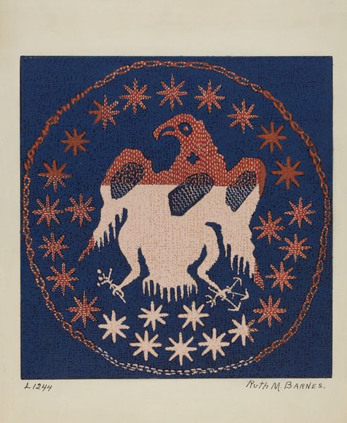 Curator: Here we have the Myddelton Biddulph Armorial Medallion, dating from around 1846, a weaving work now residing here at The Art Institute of Chicago, created by Augustus Welby Northmore Pugin. Editor: Wow, it’s got that old-world heraldry vibe but with a playful, almost cartoonish energy. I love the color contrasts—makes the wolf pop against the muted green. It's like something out of a medieval video game. Curator: The medieval inspiration is quite intentional, actually. Pugin was a major figure in the Gothic Revival, believing that medieval art and architecture embodied the truest expressions of Christian society. So he was involved in a broad political as well as aesthetic project. Editor: Right, so this isn’t just some quaint textile. This object is carrying all these… expectations. The seriousness of lineage and social roles sort of comes with it. But then that wolf! Curator: Yes, heraldry was quite popular in Victorian England. This medallion represents the Biddulph family’s coat of arms, meant to project authority, lineage, and a certain cultural position through visual symbols. The choice of textile elevates what would simply have been symbolic language. Editor: A defiant wolf seems like an odd choice to project power, doesn't it? Almost punk, like saying, "We play by our own rules!" I wonder if it's meant to hint at hidden narratives, an untamed wildness beneath that respectable veneer. Curator: Or perhaps, the wolf, as a creature of cunning and resilience, reflects a strategic shrewdness? One thing this emblem definitely points to is that the revival of medieval art wasn't only about aesthetics but also the political ideals tied to an imagined, more morally upright past. Editor: You're probably right, but the idea of these formal heraldic things as a place to hint at other layers intrigues me the most. It makes you look beyond the official story. This medallion could be someone’s quiet act of resistance, embroidered with intent, like a secret family joke. Curator: It's a very compelling thought—thank you for it! I appreciate how you were able to draw a through-line of this piece to possible deeper or personal symbolic implications of visual language and social meaning within. Editor: Anytime! Thanks for illuminating what exactly this weaving is, and what a riot it’s kicking off! I think looking for ways this wolf pushes on Victorian pretension and order in a tiny, powerful way.