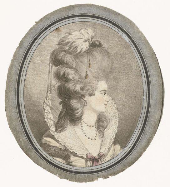 Jean François Janinet created this miniature portrait of Mademoiselle Rose Bertin, dressmaker to Marie-Antoinette. Encased within a frame of concentric ovals, the portrait presents a study in contrasts. The soft pastel hues of Bertin’s skin and attire are set against the stark black and white frame, while the airy, almost ethereal rendering of her elaborate coiffure is grounded by the solid, dark backdrop. This juxtaposition of lightness and weight, delicacy and solidity, draws our eye to the very act of representation itself. Janinet's portrait operates as a sign, encoding Bertin's identity and status through visual cues. The carefully constructed image reflects the broader cultural codes of the era, where appearance was a crucial form of communication. It challenges fixed meanings as it engages with new ways of thinking about representation. Consider how Janinet uses form to imbue the portrait with social and cultural significance, creating an image of Bertin that functions as a complex signifier within the semiotic system of the 18th century French court.