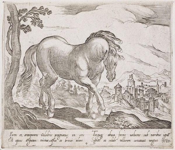 Curator: Oh, look at this, a rearing horse viewed from the rear! It’s a work by Antonio Tempesta, from the late 16th or early 17th century. Editor: It’s so…emphatic! That backside practically bursts from the frame, all bravado and coiled energy. Curator: Tempesta, born in Florence, really knew how to capture dynamism. Think of the political climate then, the Medici power struggles...it's fascinating to consider if that turmoil influenced the muscular tension of this equine figure. Editor: Absolutely. The landscape seems almost secondary, though that city in the distance hints at human ambition dwarfed by nature's force. The horse rears back, almost resisting that "civilization," a symbol of unleashed freedom. Curator: Maybe. Or maybe it’s just a very dramatic horse being very dramatic. I like the feeling it evokes. Editor: True, its expressive power is undeniable. A bold statement either way.