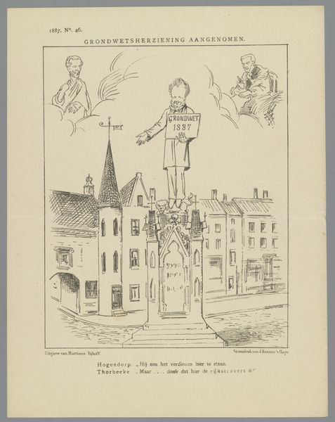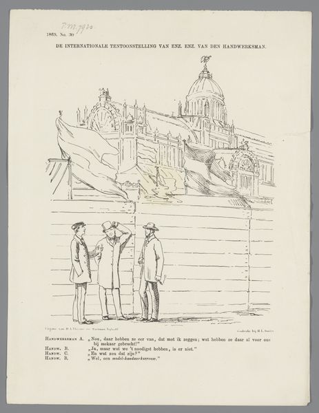 Curator: Today, we're looking at a caricature from 1886 titled "Spotprent over het Rijksmuseum, 1886" by Johan Michaël Schmidt Crans. It's a pen and ink drawing depicting a man gazing at what appears to be the Rijksmuseum. Editor: The line work immediately strikes me – incredibly precise and controlled, yet somehow whimsical. There’s a formality in the hatching that’s beautifully at odds with the cartoonish figures. Curator: Indeed. It offers social commentary. It’s published in a satirical magazine named “KOEK!”, the artist mocks a German art critic who praises a bakery exhibit in Amsterdam. The text under the image states that he found it the most remarkable creation he's ever seen. It reflects on the emerging discourse around cultural identity. Editor: So the museum, that imposing architectural facade, is equated with…baked goods? Intriguing. Consider the receding perspective—that dramatic diagonal of the draped table in front of the building. It draws the eye straight to the object of supposed wonder, a building itself is art. The formal language underscores its cultural value, or rather, questions that value by its presence in a caricature. Curator: Absolutely. It reflects a certain unease about the place of national institutions and the shaping of public taste. It’s a jab at what was considered serious culture versus the popular appeal of something as mundane as a baking exhibition. The role of cultural institutions were being scrutinized. The joke works in the dialogue between institutions and commerce in an open economy. Editor: I see the deliberate flattening of the picture plane adds to this tension. The building appears almost like a backdrop, and all the elements of depth seem forced, which may give some credit to that German critic, lost for words! Curator: It does provoke that feeling of standing too close to something too grand, the inability to reconcile its immensity. It definitely reveals how context frames our viewing experience. Editor: Well, it certainly does so through the visual rhetoric. Now that I better understand its context and intention, the line work seems less whimsical, revealing sharp cynicism! Curator: It seems we've both discovered new perspectives today. Editor: Precisely! A clever piece that makes you reconsider value.