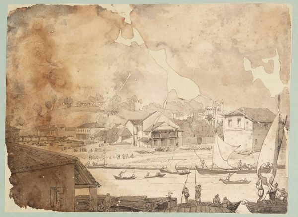 Curator: This sepia wash drawing, currently untitled, is attributed to George Chinnery, who lived from 1774 to 1852. It’s part of the Tate collection and offers a glimpse into 19th-century coastal life in China. Editor: It feels like a captured moment, melancholic almost. The monochromatic palette lends an air of nostalgia, but the figures on the rocks hint at isolation. Curator: Chinnery's work often reflects the complexities of colonial encounters. We have trading ships juxtaposed with the local population. This suggests the impact of global trade. Editor: And what about the figures on the rocks? They seem almost anonymous. Are they just observing, or are they implicated in this exchange? The drawing prompts questions about power dynamics. Curator: Precisely. The lack of detail invites the viewer to project their own understanding of colonial history and its effects on identity. Editor: Looking at this landscape, I am reminded that the legacy of colonialism is still affecting many people today. Thank you. Curator: Thank you. It's crucial to keep considering these perspectives and their reverberations through time.