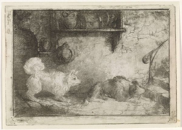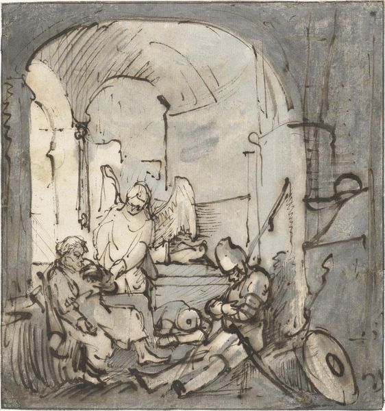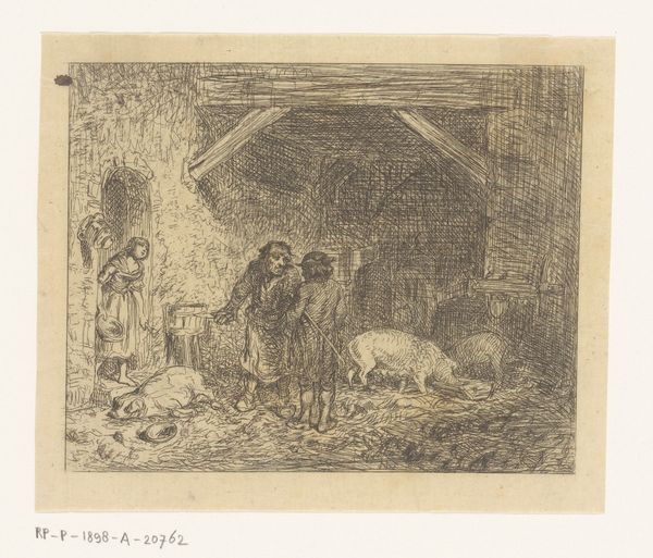 Editor: So, this is "Et lam føres ind i stalden," or "A Lamb is Brought into the Stall," by Lorenz Frølich, created in 1839. It's an ink drawing on paper. I find the composition quite striking; the framing is so distinct. What immediately stands out to you about this drawing? Curator: What captures my attention is the economy of line. Frølich utilizes ink with a masterful precision, achieving a remarkable balance between representation and abstraction. The rendering of the lamb's wool, for example, is not photorealistic, yet through short, repeated strokes, he evokes the texture vividly. Notice also the contrast between the relatively detailed foreground and the more loosely suggested landscape in the background. What compositional techniques might explain this stylistic variance? Editor: Perhaps to emphasize the immediate subject—the lamb and the shepherd—and draw our eye into the stall itself. Curator: Precisely. This calculated contrast directs our gaze and contributes to the overall visual hierarchy. Further, observe how the artist employs a limited tonal range. The subtle gradations of ink wash create depth and volume. Is it not remarkable how much information he conveys with such restraint? Consider the ways that Frölich directs the viewer's eye. How does he guide our reading of this pictorial space? Editor: It's like he's created two worlds in one frame—the interior and the exterior, subtly distinct yet linked. I’m also fascinated by how the shape of the composition itself frames the subject matter. Curator: A keen observation! The ovoid form, containing the scene, lends the work a unique character and reinforces its formal integrity. By considering line, form, and tonal value, we gain a deeper appreciation for the artist’s skillful manipulation of visual language. Editor: I never would have thought of it that way. Seeing it as a language is really helpful. Curator: Indeed. Art often speaks most powerfully through its formal elements. A perspective worth constantly refining.
