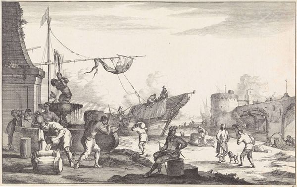 Editor: This is Giuseppe Vasi’s "View of the Tiber and Aventine Hill in Rome" from 1771, an engraving that presents a detailed cityscape. It seems very industrious, almost a romantic depiction of labor. What strikes you most about this piece? Curator: As a materialist, I find the depiction of labor and the implied social structure fascinating. Note the different forms of labor represented: from the figures manually unloading the boats, to the implied commerce and transport via the Tiber. It asks us to consider not only *what* is being made and moved, but *who* is doing the making and moving, and under what conditions. Editor: That’s a good point. I hadn't thought about it like that. Does the choice of engraving as a medium enhance that focus? Curator: Absolutely. Engraving, a process requiring skill, time, and a very specific set of tools, highlights the materiality of artmaking. Every line, every shadow, is a result of deliberate physical action. This connects to the physical labor represented in the scene. Vasi is representing a social system *and* engaging in one through the production of the print. How might the availability of prints impact consumption and access? Editor: It democratizes art, making cityscapes like these accessible to a broader audience than unique paintings would be. And that access influences what they consume, and think about... Curator: Precisely. The print becomes a commodity, shaped by the material processes of its creation, influencing the consumption habits and perceptions of its viewers, thus fueling the economy and, potentially, reinforcing or challenging existing social structures. Editor: I hadn’t thought about the layers of labor embedded within it, both in the scene depicted and in the production of the engraving itself. Thanks! Curator: It shows how close attention to the materiality of art can reveal so much about its broader social and economic context. A truly insightful piece!