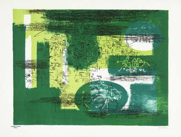 Curator: David Leverett, born in 1938, created this work, "Two Faces of a Place." It's currently held in the Tate Collections and presents a fascinating interplay of image and text. Editor: My first thought? Fragmented memories. It feels like a landscape seen through a broken window, or a dream slowly fading. Curator: The layering here is key. Leverett is exploring how we construct meaning through both visual representation and language, challenging the idea of a single, unified perspective. It brings up questions of accessibility, particularly with the script overlaying the landscape. Who is invited to "read" this place? Editor: Absolutely. It’s like the landscape is trying to speak, but the words are almost illegible, like a half-forgotten poem scribbled in a fever dream. Are we meant to decipher it, or just feel the texture of the words? It's like he's blurring the line between seeing and feeling. Curator: Perhaps both. The act of trying to decipher it, of engaging with the fragmented text, becomes part of the experience. The "touch of Braille" that's actually written there is very interesting too: is the landscape inviting you to 'read' it? I keep thinking about what it means to 'read' a landscape at all. Editor: You know, looking at it again, there's a certain melancholy to it. It's beautiful, but also unsettling. Like a place that's been loved, lost, and remembered imperfectly. Curator: Precisely. It makes me consider our relationship with place, memory, and the stories we tell ourselves about them. Editor: It really is a piece that stays with you, whispering its secrets long after you've walked away.