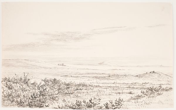 Joakim Skovgaard made this pencil drawing, "Landskab med udsigt mod højderyggen Höråsen. Öströö," whose date is unknown, but is held at the SMK. The pale graphite lines on the cream paper create a simple, tranquil scene of the Höråsen ridge in Öströö. The subdued palette and delicate application evoke a mood of quiet contemplation. Skovgaard’s composition employs a structural approach by dividing the landscape into three horizontal bands: the foreground, the middle ground featuring the ridge, and the sky. This arrangement creates depth and invites the eye to explore each layer. The diagonal strokes in the foreground contrast with the more softly rendered ridge. The single windswept tree on the right acts as a visual pivot, drawing our attention to the subtle but powerful forces of nature shaping the landscape. Ultimately, Skovgaard captures a moment in time, rendered with an economy of means that invites viewers to contemplate the interplay between nature and representation. It offers a glimpse into Skovgaard's engagement with the landscape, reflecting the artist's internal landscape, where each line and shadow serves as both record and reflection.
