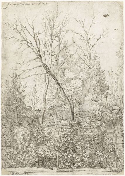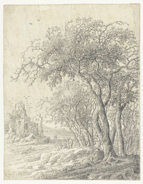 This is an anonymous etching, titled "Rivieroever met bomen", residing in the Rijksmuseum. The print is dominated by a dense network of fine lines, forming a detailed depiction of trees along a riverbank. The monochromatic palette enhances the textural contrast between the foliage, the water's surface, and the sky. The composition invites a structural analysis. The intricate lines coalesce to create varying densities of light and shadow, evoking a sense of depth. The arrangement of trees guides the eye, leading it to wander through the landscape. The image destabilizes conventional perspectives, offering a complex interplay between foreground and background, where the details of the trees are as sharply rendered as the distant landscape. This etching operates as a semiotic system. The lines, as signifiers, create a signified landscape, reflecting broader philosophical interests in perception and representation. The work doesn't seek to replicate reality but to construct a visual language that challenges our understanding of space. Through its formal elements, the print engages in an ongoing dialogue about art's capacity to shape and reshape our perception.