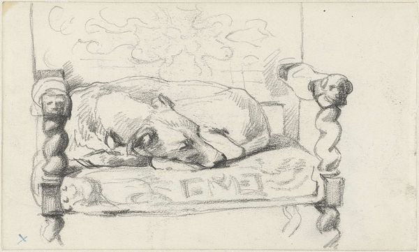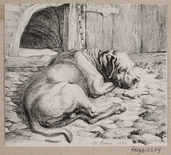 Rembrandt van Rijn created this etching of a "Sleeping Watchdog" using metal, acid, and ink. Etching is an indirect method of engraving, where the artist covers a metal plate with a waxy, acid-resistant layer, then draws through it with a stylus to expose the metal. Dipping the plate in acid eats away the exposed lines, creating grooves that hold ink. The deeper the bite, the darker the line that will appear. The printmaking process is labor intensive: the preparation of the plate, the careful biting by the acid, and finally the printing of the image. Here, Rembrandt uses these linear qualities to render the texture of the dog's fur, the wooden planks of the kennel, and the chain that tethers the animal. Though seemingly humble, Rembrandt is imbuing this image of an everyday working animal with artistic value. In doing so, he challenges hierarchies, elevating the so-called 'minor' arts to the same level as painting. By understanding how this print was made, and the skilled labor involved, we recognize it as a conscious artistic statement.