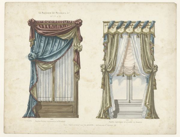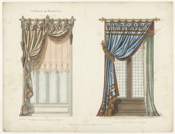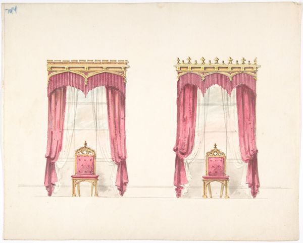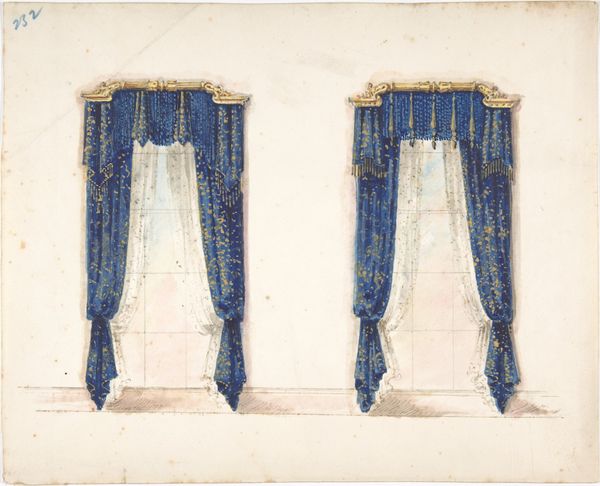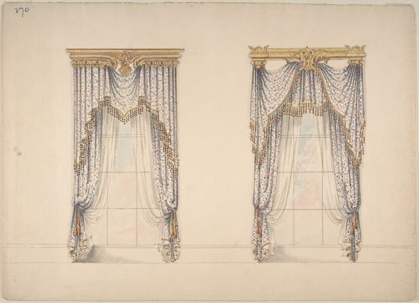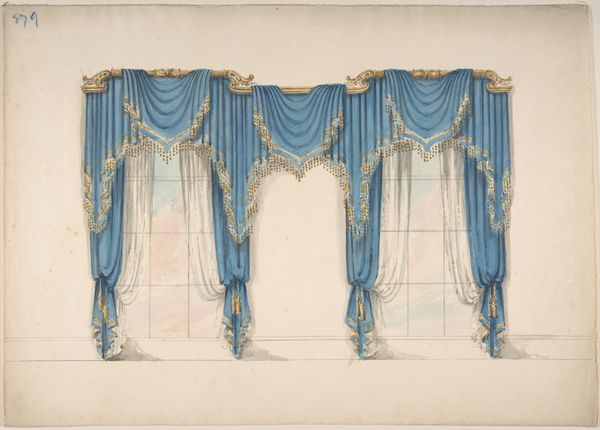 Curator: Here we have an intriguing piece titled "Design for Gold Curtains with Gold Fringes and a Gold and White Pediment," likely dating from somewhere between 1800 and 1850. Its authorship is, unfortunately, anonymous. Editor: Well, my first impression is one of opulent restraint. The color palette is so muted, almost grayscale, but the proposed design screams luxury. Curator: Exactly! That tension is palpable. Given the period, and the stylistic nod to neoclassicism, this drawing provides insight into the aspirational decor of the burgeoning bourgeoisie. Imagine these installed in a salon meant for political discourse. Editor: I'm fascinated by the rendering. Look closely at how the folds of fabric are depicted using pencil, tempera, and watercolor. It really draws your attention to the labor involved in producing the materials, the skill required to translate design to tangible goods. Those fringes suggest incredibly intricate work. Curator: Indeed. The attention to detail hints at a specific patron, perhaps someone keen to display wealth and cultivated taste through the textiles themselves. It also points to the crucial role interior design played in shaping social hierarchies during this era. Think about how this vision of decorative art reinforces certain social structures. Editor: You are right. We're considering everything required for this design: the sourcing of gold thread, the weaving of the fabric. It presents interesting questions about labor conditions at the time. I find it hard to appreciate the refinement and not consider the means to acquire these precious materials and skillful manufacture. Curator: Absolutely, and it reminds us that artistic expression is almost always linked to the power dynamics of its historical moment. The elite commissioned luxury goods not just for personal enjoyment, but to communicate social dominance. Editor: In the end, considering this design sketch forces us to confront how objects both reflect and shape social conditions. What appears delicate has profound social implications. Curator: A powerful example of the dialogue between design, history, and the material world. Thank you.