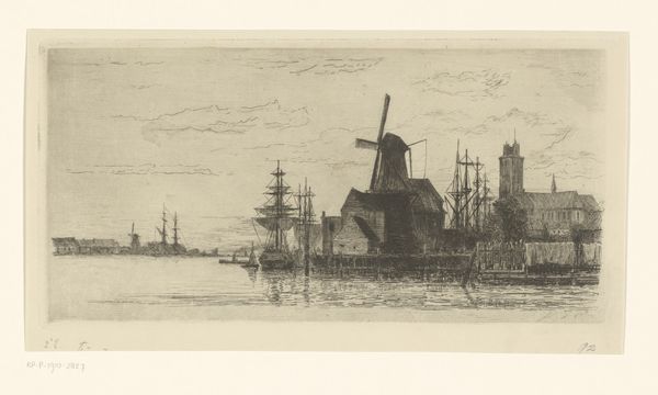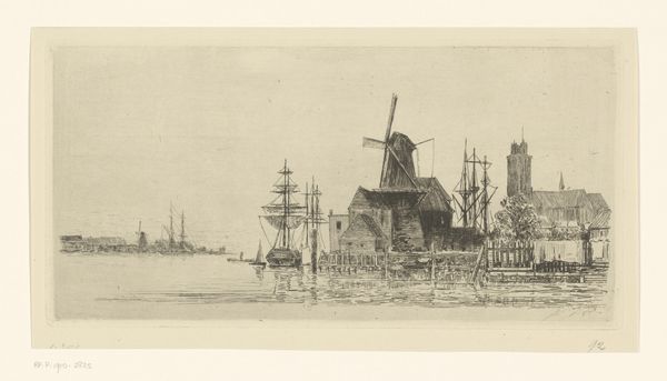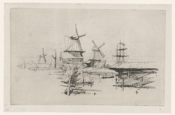 Carel Nicolaas Storm van 's-Gravesande created this etching, "Drie molens in Dordrecht," capturing a Dutch landscape marked by windmills and waterways. Born in the Netherlands during a time of significant social and economic change, van 's-Gravesande lived through the decline of traditional industries, which deeply affected Dutch society. His artistic representations of windmills – once symbols of Dutch power and innovation – evoke a sense of nostalgia for a bygone era. Look closely, and you'll notice a sailing ship, juxtaposed against the traditional windmills. It's hard not to wonder if this was a deliberate commentary on the changing times, where sail power gave way to steam. The detailed rendering of light and shadow in the water invite us to reflect on themes of change and loss that resonate even today.