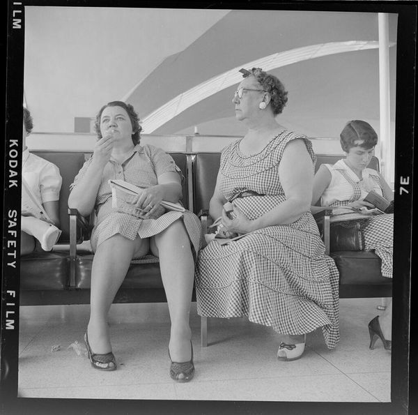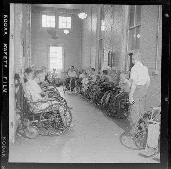 Curator: This photograph, by Jack Gould, currently titled "Untitled (child on crutches with nurse)," is a small but striking image. Editor: It feels so stark, doesn't it? The high contrast and those unforgiving tiled walls create an almost clinical atmosphere. Curator: The composition, with the child centered and supported by the nurse, directs our gaze right to the resilience in the child's expression. Editor: And those dark circles under the boy's eyes—they tell a silent story, don't they? It makes you wonder about his journey. Curator: Absolutely. There's a lot of emotional tension in the image despite its apparent simplicity. Editor: Yes, it's a testament to Gould's ability to capture such vulnerability and strength within such a small frame. Powerful. Curator: Indeed. A poignant snapshot into a moment of life, preserved.