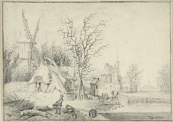 Editor: Here we have François Collignon's "A Windmill without Sails, a Man Reading in the Foreground." It's small, only about 11 by 21 centimeters. I'm struck by the contrast between the stillness of the foreground and the implied movement of the windmill in the background. What do you see in this piece? Curator: The linear precision and delicate hatching create a dynamic interplay of light and shadow, wouldn’t you agree? The bare windmill becomes a stark geometrical form. Consider the relationship between the reading man and the dilapidated structure; what symbolic tension does that suggest? Editor: I hadn't thought about the symbolism, more just the visual contrast. It’s interesting to consider the windmill as a shape rather than a function. I'll definitely look at it differently now. Curator: Exactly. Visual analysis allows us to decode deeper meanings within the formal elements.