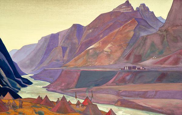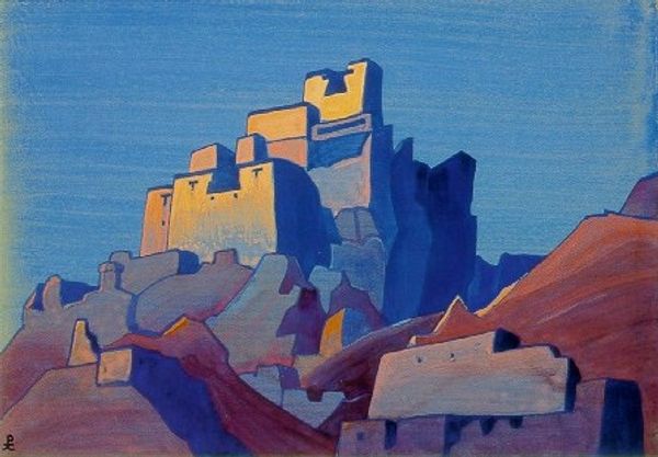 Curator: Oh, look at this canvas—"Ladakh. Sunset." by Nicholas Roerich, painted in 1933. Isn’t it something? Editor: Absolutely. It feels… strangely serene. There’s a quiet drama in the muted reds and blues playing across those geometric mountains. The sunset hues give it an almost otherworldly glow. Curator: Roerich was deeply influenced by Eastern spiritualism and theosophy, which shines through in his landscapes. He aimed to depict not just the external beauty, but the inner, sacred quality of these Himalayan regions. Editor: And the architectural elements, the monastery, feel almost carved from the mountain itself, existing in harmony. But do you think that’s romanticizing the cultural context a bit? The exotic “Orient” as seen through a Western lens? Curator: I see your point about Orientalism—it’s valid to consider. But I also think Roerich was genuinely moved by the spiritual heritage he encountered. He saw the East as a source of profound wisdom, which, at the time, stood in contrast to what he perceived as the materialism of the West. His fascination certainly informed his distinctive palette and flattened, almost stylized forms. Editor: True. And that stylization gives it an iconic quality. Like a memory distilled, simplified into its essence. How does this painting resonate within Roerich’s larger body of work? Curator: Roerich created hundreds, even thousands, of these Himalayan landscapes. He wasn't just an artist; he was an explorer, a cultural ambassador. He sought to document these landscapes while imbuing them with symbolic meaning, reflecting his philosophical beliefs. It's not just about recording what he saw, it's about conveying a sense of spiritual place, that interconnectedness he felt so strongly. Editor: Right, almost creating a visual mantra. Considering the socio-political backdrop of the 1930s, the world teetering, this artistic focus on peace and spiritual connection feels like a profound act of defiance and hope. Curator: Indeed. Looking at it now, almost a century later, this sunset in Ladakh whispers still. It’s like a timeless reminder. Editor: A reminder that even amidst geopolitical turmoil, there are places—inner and outer—where the mountains hold their peace, unchanged by human folly.