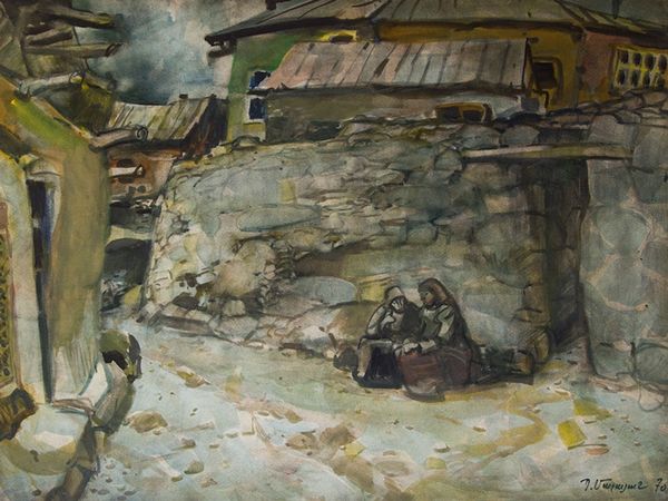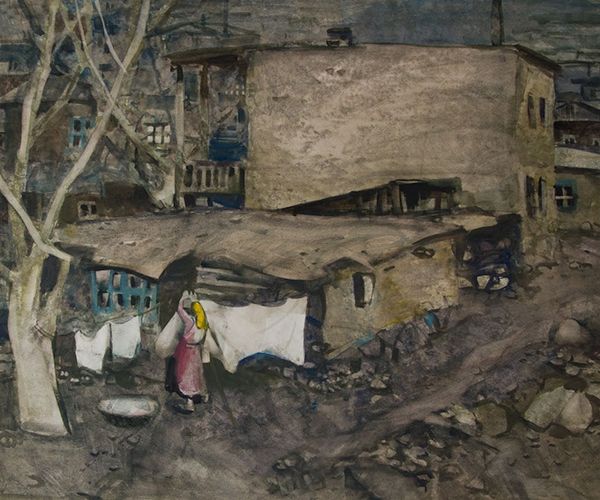 Petros Malayan painted "Old Yerevan, Kond" using subdued earth tones and fragmented forms. The composition presents a cluster of old buildings stacked upon each other, constructed with uneven lines that create a sense of precariousness. Malayan's choice of color is striking. The limited palette is dominated by browns and grays, which evoke a feeling of decay. Yet, scattered throughout the painting are dashes of brighter colors: blues and yellows, which hint at an underlying vitality. These moments of color serve as visual signifiers, injecting an emotional complexity. The semiotic interplay between decay and vitality challenges fixed ideas. The buildings appear almost as if they’re collapsing into each other. The effect destabilizes our understanding of space and perspective. The artwork functions as more than just an aesthetic experience. It acts as a cultural artifact, inviting ongoing interpretation.