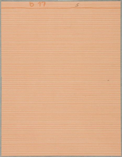 Curator: Looking at this, I feel a sense of calm, a muted stillness almost. It's like a blank canvas whispering possibilities. Editor: This is a wallpaper sample, carefully removed from BR49.467, created by the Bauhaus Wall-painting Workshop. It prompts us to consider the everyday, the designed environment. Curator: Exactly! It makes you wonder about the room it once adorned. What were the conversations, the dreams held within those walls? It is a little bland without further detail, wouldn't you say? Editor: Perhaps, but consider the context. The Bauhaus sought to unify art, craft, and technology, to democratize design. This humble sample embodies that ethos, prioritizing function and accessibility. It represents a move away from ornamentation toward a more utilitarian aesthetic. Curator: So, it is as much about what isn't there as what is? Very interesting. Editor: Precisely. It's a testament to the Bauhaus's radical vision for modern living, a social project in the guise of a design choice. Curator: I see that, and feel something deeper now. It almost invites one to project their own meaning, their own colors, onto its surface. Editor: Absolutely. Its apparent simplicity offers a profound invitation for engagement and reflection.