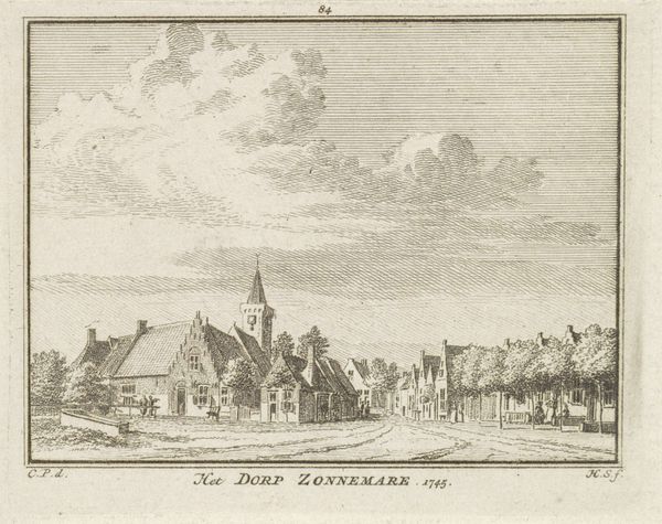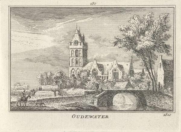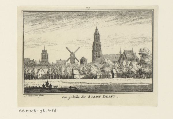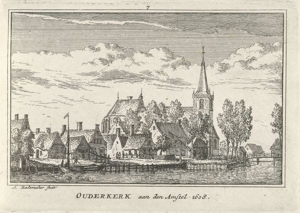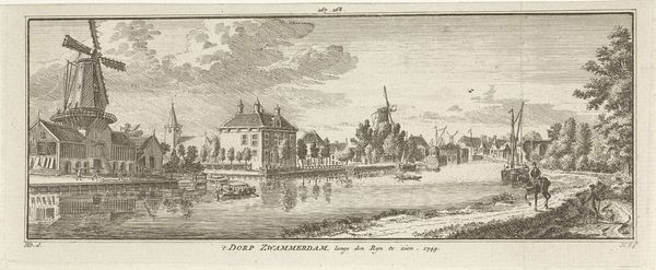 Curator: Abraham Rademaker created this "Gezicht op Dordrecht, 1650" between 1727 and 1733. The print, currently held at the Rijksmuseum, showcases a vibrant cityscape in engraving. Editor: Immediately, I'm drawn to the sense of industry—the windmills, boats, and figures all contribute to the idea of a working port. The intricacy of the etching creates a world that is active, even lively, despite being rendered in monochrome. Curator: Rademaker, working well after the Dutch Golden Age, looked back to it, employing techniques such as engraving which democratized image production through replicability. Note the detail on the boats, the textures—all achieved with accessible tools. What can you tell me of the emotional experience that is constructed by the imagery itself? Editor: The soaring tower of the Grote Kerk dominates the horizon, signifying Dordrecht’s power and prominence but it is tempered by the mundane –the figures walking near the bridge, the windmills suggesting labor, and the overall composition hints at faith deeply embedded in the working day-to-day life. It suggests a certain moral rectitude – that industry is blessed by a higher power, doesn't it? Curator: The repetition of linear forms—in the sky, water, and architectural details—speaks volumes about artistic production at that time. I am more interested in considering the materials Rademaker selected; that he elected engraving reveals this decision had very tangible socioeconomic and political purposes behind the choices he made. Editor: Of course, it makes you consider the wider cultural meaning embedded in even humble everyday acts such as walking along a riverbank or shipping. Curator: Looking closely at Rademaker’s cityscape of Dordrecht, my interpretation underscores the work’s importance as a historical object indicative of the labor and choices that go into making pictures. Editor: And I see the engraving serves as a portal connecting to an older cultural time, with deep echoes for any careful viewer.