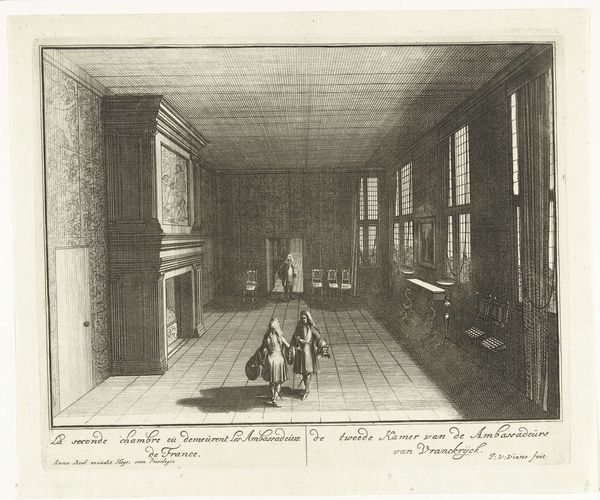 Jan van Vianen created this etching in 1697, depicting the Kamer van de Franse ambassadeurs in the Huis ter Nieuburch in Rijswijk. The composition is rigidly structured, drawing our eye into the depths of the room through linear perspective. Lines of the ceiling, floor and walls all converge to create a sense of depth and order. The interior's formality is emphasized by the symmetrical placement of windows and the central positioning of the ornate fireplace. The texture of the tapestries and ceiling is rendered with meticulous detail, contrasted by the smooth, flat planes of the floor. This emphasis on architectural precision and decorative detail reflects a broader interest in rationalism and order during the late 17th century. The etching functions not just as a record, but also as a carefully constructed representation of power and diplomacy. It invites us to consider how spaces are designed to convey authority.