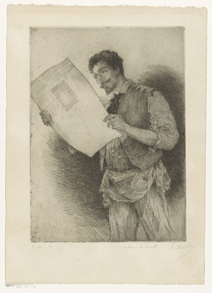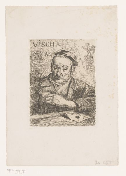 Curator: Good morning. We’re standing before “Drukker bestudeert een proefdruk,” which translates to "Printer Studies a Proof," an 1891 pencil drawing by Frans Proost. Editor: The gentleman has the air of a burly, contemplative sea captain! There's something about the light pencil work that suggests a dream, as though he were plucked from the midst of typesetting into a sort of reverie. Curator: Interesting take! Considering its context, Proost, though a painter, engaged considerably with printmaking and its community in Belgium at the time. This work celebrates labor, capturing not just the act of creation but the critical, contemplative phase where quality is assessed. Editor: Quality, yes! And that face! You know, you can almost feel the paper’s texture and his critical eye. I love how the artist hasn’t quite ‘finished’ it. Makes it more lively, more real. As if we’ve just interrupted his thoughts. Curator: Indeed, the 'unfinished' quality also hints at the ephemeral nature of news and print. These items were intended for distribution, often disposable, carrying urgent but ultimately transient messages. Art elevates the fleeting moment. Editor: And what about that fancy cane back there? Adding a touch of... drama, maybe? It is like, "Okay, let's talk business – and I have a stylish stick." Or perhaps, it's more about emphasizing the intellectual stature and craftmanship behind the work. A visual suggestion to give gravitas to a tradesman. Curator: Good point. Status, craft, knowledge are intertwined and highlighted. The cane suggests that the portrayed individual holds a respected position, both skillful in their craft and respected by their community and patrons. This also raises interesting questions, perhaps, about the politics of image making. Who gets depicted and in what context? Proost presents him, dignified and central, in what would have been a rising medium, making it accessible. Editor: And this gives us plenty of insight into our culture, as it existed then... Well, it's certainly given me a new appreciation for the printmaker! Curator: Absolutely, and an enduring question: the nature of image distribution, and who ultimately controls the message.