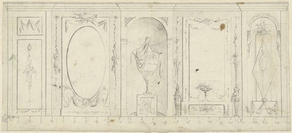 Curator: Oh, this is a rather curious piece! It’s a design by Abraham Meertens, titled "Ontwerp voor kamerversiering met verticaal twee panelen, de onderste met een chinoiserie." The inscription places it sometime between 1767 and 1823. It's a pencil drawing, a plan for room decoration. Editor: My first impression is one of understated elegance. It’s linear and sparse, but the composition feels meticulously balanced. There's something both airy and classical about it, but also like a theater stage. Curator: Precisely! Meertens appears to be channeling a refined aesthetic popular in the late 18th century. Notice how the architectural elements are juxtaposed with delicate floral garlands and the playful cherub at the top. It speaks of a culture where art and life were intimately intertwined. This precise style must have had a huge social significance at that time. Editor: The central oval panel containing a tiny scene certainly draws the eye. It's a glimpse into another world, almost like a dreamscape contained within this formal structure. What does this inclusion mean to you? Curator: For me, that central image resonates deeply. The enclosed scene might represent an idealized past, or perhaps a future aspiration—it operates almost like a mnemonic device, prompting contemplation on themes of memory, aspiration, and our place in the unfolding story. I can't help but consider it to be another symbol within a cultural dream, revealing to us what they deemed important in life. Editor: The vertical panels on each side draw my attention. While one is decorated with flower ornamentation, the other is just a line. This reminds me of the difference of art and society from a historic view. One side wanted ornamentation while the other wants the simple linear structure. Curator: It is almost like looking into a philosophical division between the different eras! The very idea of domesticating one's surroundings through such refined aesthetics reveals a profound connection to the inner life. To display is to control, to design your interior space to be perfect. Editor: Looking at this drawing really illuminates not just the artistic taste of the period but also the deep seated needs this design fulfilled—a craving for beauty, order, and perhaps, an escape from the mundane. Curator: A truly revealing sketch, hinting at so much beneath its delicate lines.