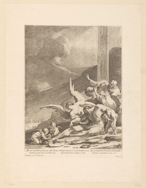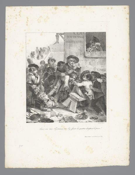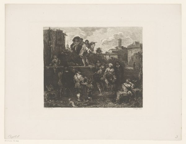 This print, "Three Children Playing a Game with Fruit Pits", was made by Augustin de Saint-Aubin in the 18th century. It's an etching, a process that involves coating a metal plate with wax, drawing a design, then immersing the plate in acid, which bites away the exposed lines. The material process here isn’t just about aesthetics, but also about the social context. Etchings like this were a form of mass production, making images accessible to a wider audience, and a means of communicating ideas about childhood and society. Look closely and you'll see how the artist used the etched line to create texture and depth, from the rough stonework behind the children to the delicate rendering of their clothes. This wasn't just a neutral depiction of children's games, but a commentary on class and fate. The act of etching, with its ability to replicate and disseminate images, becomes a tool for social commentary. The print encourages us to consider the relationship between art, labor, and the society in which it was made, challenging the traditional view that fine art is separate from everyday life.
