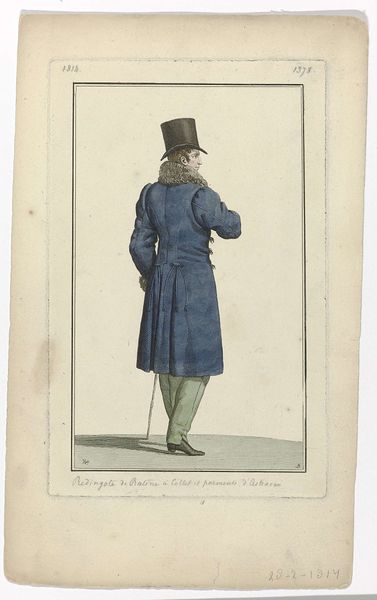 Pierre Charles Baquoy created this print, titled "Journal des Dames et des Modes, Costume Parisien," in 1810, a time when fashion became a powerful indicator of social standing in post-revolutionary France. This image, seemingly a straightforward depiction of men’s fashion, reveals a complex interplay of identity, class, and gender. The dandy, with his meticulous attire, was an emerging figure, challenging aristocratic norms while reinforcing a new bourgeois order. The ‘chapeau pointu’ and ‘carrick’ weren’t just clothing items; they were statements, carefully constructed to navigate the shifting social landscape. One can imagine the emotional weight of these sartorial choices, a daily performance of identity in a society still grappling with the aftershocks of revolution. Does this figure represent a break from traditional masculine roles, or a perpetuation of class-based distinctions through new means? How might the women engaging with this fashion journal feel about these carefully constructed images of men? This print invites us to consider how clothing shapes our understanding of ourselves and others, reflecting the personal and societal tensions of a rapidly changing world.