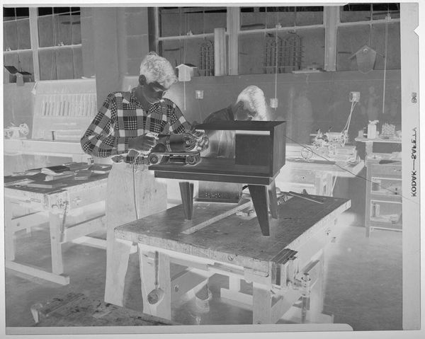 Curator: This intriguing image from the Harvard Art Museums, by Martin Schweig, shows a young woman and an older man in what appears to be a workroom. Editor: It's like looking into a faded memory, isn't it? The light, the way they're posed...it feels intimate, but also a bit melancholy. Curator: Absolutely. The composition and subject matter bring to mind questions of labor, gender, and intergenerational relationships, especially in the context of post-war America. The woman's gaze, in particular, speaks volumes about her role in that space. Editor: I keep wondering what they're building or fixing. There's a palpable sense of shared purpose, but with an undercurrent of... yearnings, maybe? Curator: Precisely. Schweig captures a dynamic that invites us to consider the power dynamics inherent in the workspace. Editor: I love how it makes me feel so much by revealing so little. Curator: A testament to the power of a single image, isn’t it?